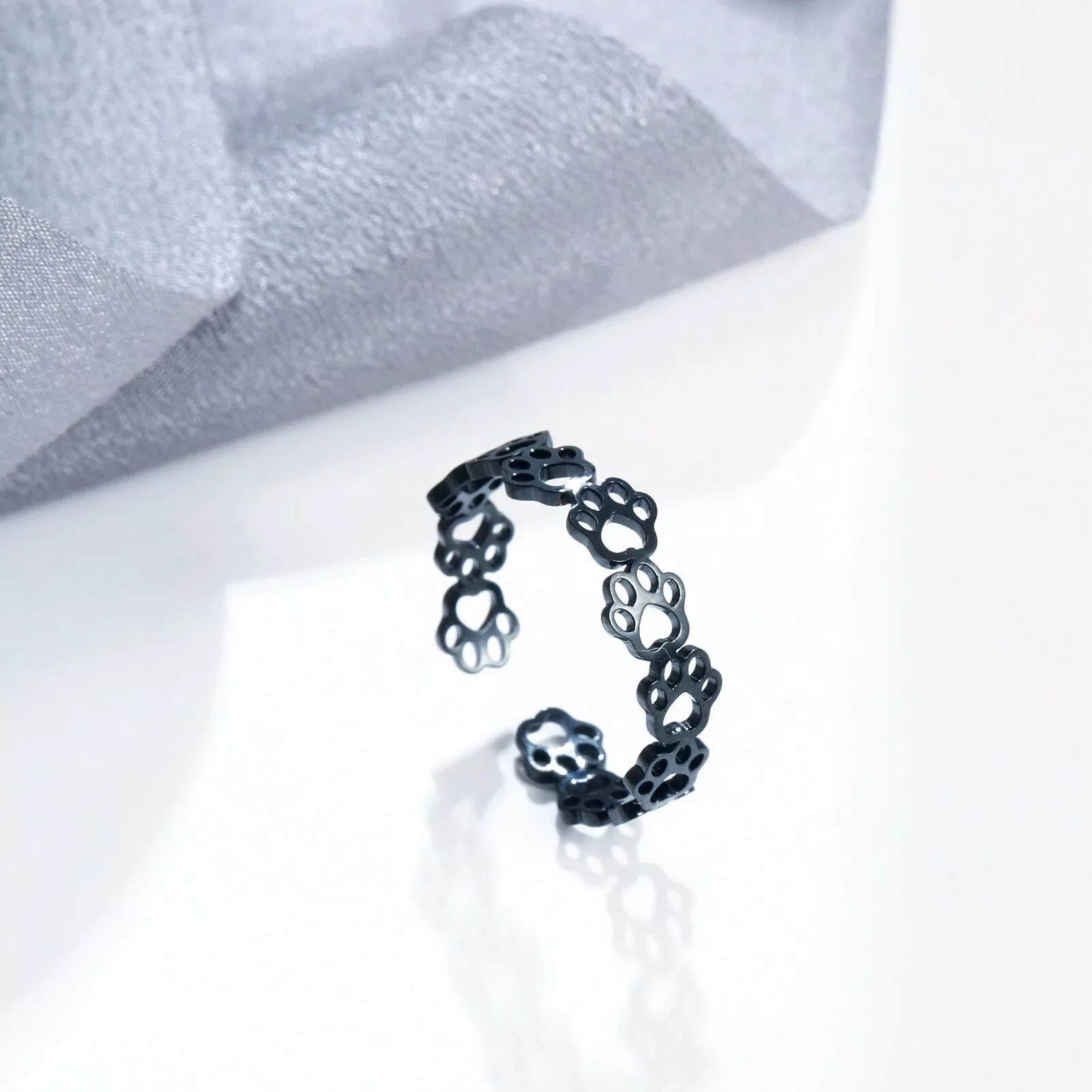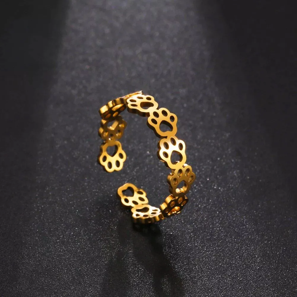 This delightful ring showcases a cute animal paw print, symbolizing the love and bond shared with our furry friends. Crafted with precision, it’s available in three elegant colors – classic steel, luxurious gold-plated, and sleek black. The adjustable design ensures a comfortable fit for any finger size, making it a versatile accessory for all.
