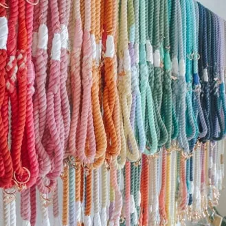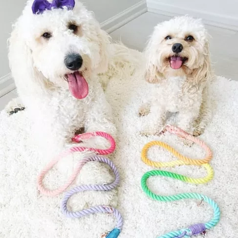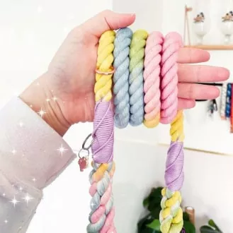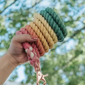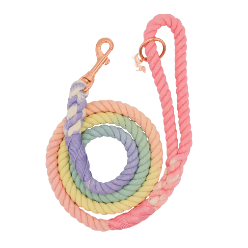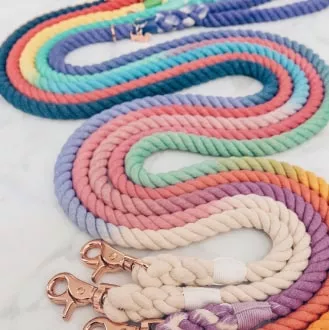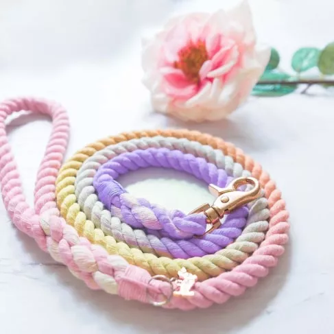 The natural dye of the leash comprises all the shades of rainbow colors: ombre pink, orange, yellow, green, blue, and purple. It also has beautiful rose gold hardware with a matching dog charm and accessory ring.