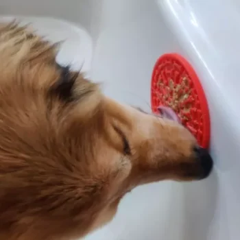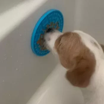 My chihuahua hates getting baths and before I bought this would bite the water and growl. But now that I use this, she’s occupied for the whole bath. Is she calm, no, but this thing isn’t a miracle. But it does the job! It has really good suction and doesn’t move around when I’m bathing her. Some people said it’s hard to clean but I haven’t experienced this. I put it in the sink and run hot water on it, then pop it in the dishwasher and it comes out clean.