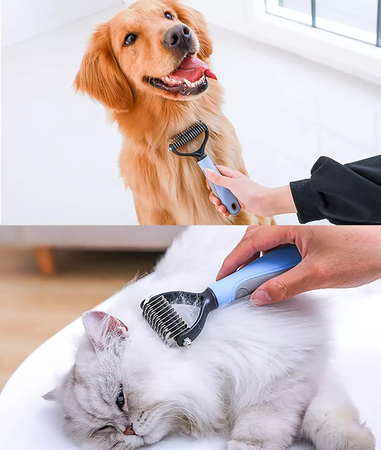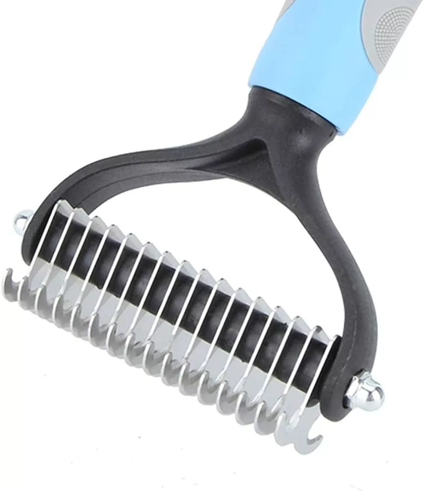 I've finally found the holy grail of pet grooming with this double-sided hair remover! It's a complete lifesaver, tackling the stubborn knots and loose fur on my golden retriever with ease. The stainless steel teeth glide through tangles without any discomfort, leaving behind a beautifully smooth coat. What's more, I've noticed a healthy sheen and less shedding around the house. The ergonomic design makes it comfortable for both of us during grooming sessions. A must-have for any pet owner tired of fur-covered furniture!